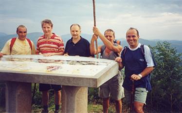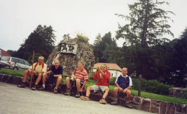 * 18 août 2001, traversée des Pyrénées dans le sens Nord-Sud de Saint-Jean-Pied-de-Port (181 m.) à Roncesvalles (947 m.) en suivant le GR 65 ou chemin de Saint-Jacques de Compostelle (Camino de Santiago), en partant de la rue d'Espagne pour passer sous la Porte d'Espagne, suivre Sud-Sud-Ouest la route D 428 dite "Route Napoléon" et passer près de Ithurburua (232 m.), à Othatzénéa, puis direction générale Sud à Etcheverrigaraya (291 m.), à Etchebestéa (312 m.), au hameau de Honto (490 m.), pour quitter la route 300 mètres après afin de suivre à gauche (480 m.) une piste qui monte raide en lacets pour retrouver la route plus haut, près d'une table d'orientation (703 m.) et la suivre direction générale Sud, passer à l'Ouest du pic d'Orisson et d'Itchachéguy, au col de la vierge d'Orisson ou de Biakorri (1095 m.), au Sud du proche sommet du pic d'Hostatéguy (1142 m.), au col d'Elhursaro (1152 m.), à l'Ouest du proche sommet d'Urdanasburu, à l'Ouest du proche sommet du pic d'Urdanarre, pour quitter juste après la route D 428 près de la croix Thibault (1225 m.) et suivre à droite, Sud, une piste qui passe un peu plus haut sur le flanc Occidental du pic de Leizar Atheka, à un petit col (1296 m., borne frontière numéro 198), près de la fontaine de Roland, sous le proche col de Bentarte (1344 m., borne frontière numéro 199) et suivre direction Ouest-Sud-Ouest la piste qui franchit la frontière et traverse une forêt pour passer sur le flanc Nord de Txangoa et de Menditxipi, puis direction Sud-Sud-Ouest passe au collado (col) de Lepoeder (1435 m.), descend pour traverser la route qui mène à droite au Puerto de.Ibañeta et à gauche au sommet d'Ortzanzurieta, et continuer la descente Sud-Ouest en forêt, passer à Sabukadi (1156 m.) et terminer direction Ouest à l'abbatiale de Roncesvalles/Orreaga (Roncevaux) et au monumento a la batalla de Roldán ou batalla de Roncesvalles (monument dédié à Roland et à la bataille de Roncevaux) (947 m.).