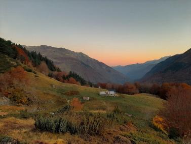 Parti de nuit à 8 heures, j'ai suivi le sentier qui monte dans la forêt communale de Borce ou bois de Sansanet dans la pénombre avant le lever du jour qui s'est produit lors de la jonction avec la piste qui mène à la cabane d'Escouret. La crête qui suit le passage du dôme coté 1704 présentant un raide ressaut couvert de givre