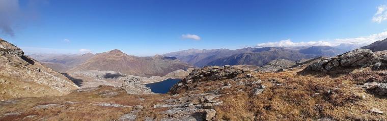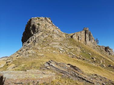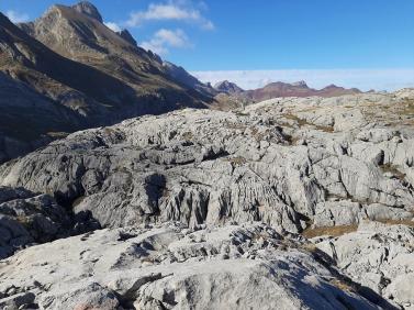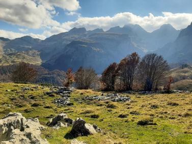 , je suis descendu d'une quarantaine de mètres de dénivelé pour rejoindre le fond du vallon du ruisseau d'Escourèts afin de remonter un peu plus loin récupérer la crête de Cantal de Escurets. Après un parcours en montagne russe et avoir traversé un plateau suspendu je réalisais la jonction avec le sentier balisé rouge et blanc du GR 11 espagnol à 10 h40. En parvenant à l'entrée Nord de la valle de los Sarrios (vallée des Isards) les nuages venant de derrière les sommets du circo (cirque) de Olibón commençaient à descendre vers la vallée et un vent violent m'accompagnera jusqu'au sommet Occidental de La Trinchera. La carte Editorial Alpina 1:25000 Candanchu Canfranc mentionne "La Trinchera", qui se traduit en français par "Tranchée", pour désigner l'étroit couloir qui relie le plateau suspendu à l'entrée Nord de la valle de los Sarrios (vallée des Isards). Le panorama offert par ce modeste sommet est assez limité et il faut s'avancer de quelques mètres vers le Nord pour voir le ibón de Estanés (lac d'Estaens). Abrité derrière un rocher pour me protéger des fortes rafales de vent je faisais une pause restauration de 12 heures à 12 h45. Après un parcours chaotique à travers la grande zone de lapiaz de la crête de Cantal de Escurets, je passais à 14 h15 au Puerto de Estanés pour y suivre "l'autoroute" qui ramène dans la forêt communale de Borce ou bois de Sansanet qui offrait de magnifiques couleurs automnales. Je retrouvais ma voiture, seule à mon départ, sur un parking où il ne restait presque plus de places à 15 h30 après un dénivelé positif d'environ 1000 mètres pour autant de négatif et une journée bien ensoleillée mais aussi bien ventée.